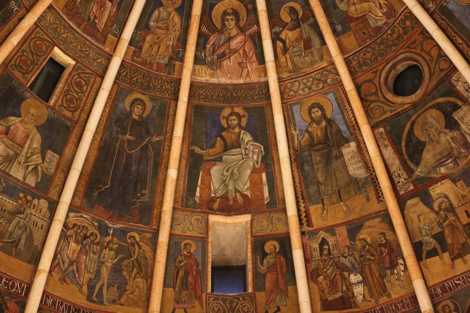 I know what you're thinking! "How can there be a dome inside when I don't see one on the outside?" (Surely not, "Why does she think I care about a baptistery?") That's one of the things that interesting about the architecture - the dome is disguised behind straight walls on the outside. You can see in the night photo above that the windows only go partway up.
