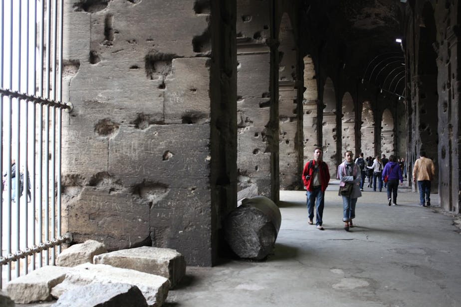 Then, finally, the Colosseum. Our hearts sank when we saw how long the line was - it probably would have taken an hour to get in. But we decided to take a salesman up on his offer of an English guided tour that skips the queue, for €8 on top of admission. It started outside with a bit of entertainment, including crowd-involved humor and a guy dressed up as a gladiator, which was only mildly amusing lasted longer than we might have liked.