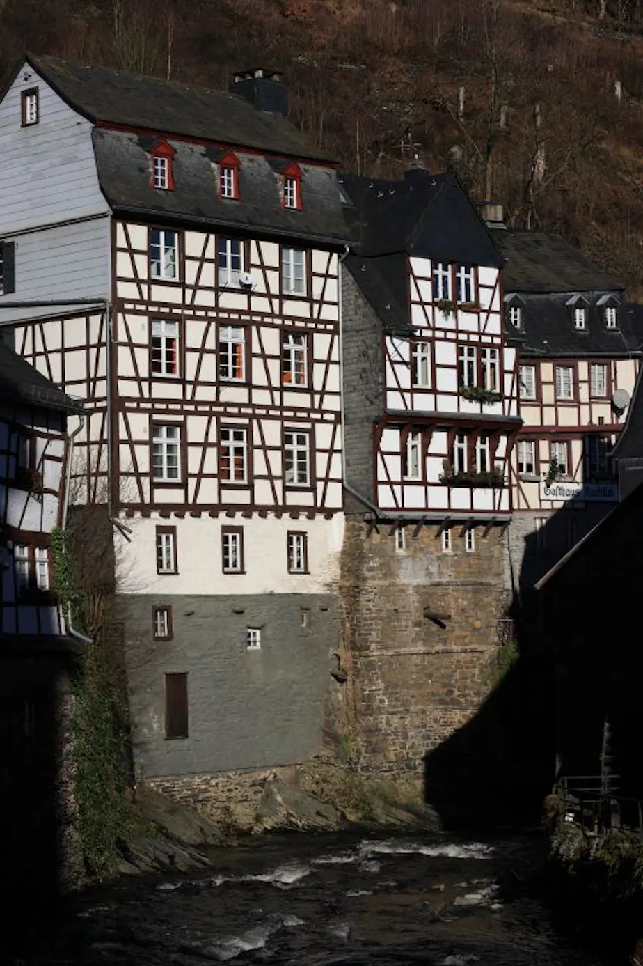 We did have one sunny day a week ago Sunday, so we made a day trip west to Monschau. This is a quaint hillside village about an hour and a half away that our landlord has been insisting we visit ever since we got here. It was indeed very nice, located in the scenic Eifel National Forest and with lots of half-timbered houses overlooking a mountain river.