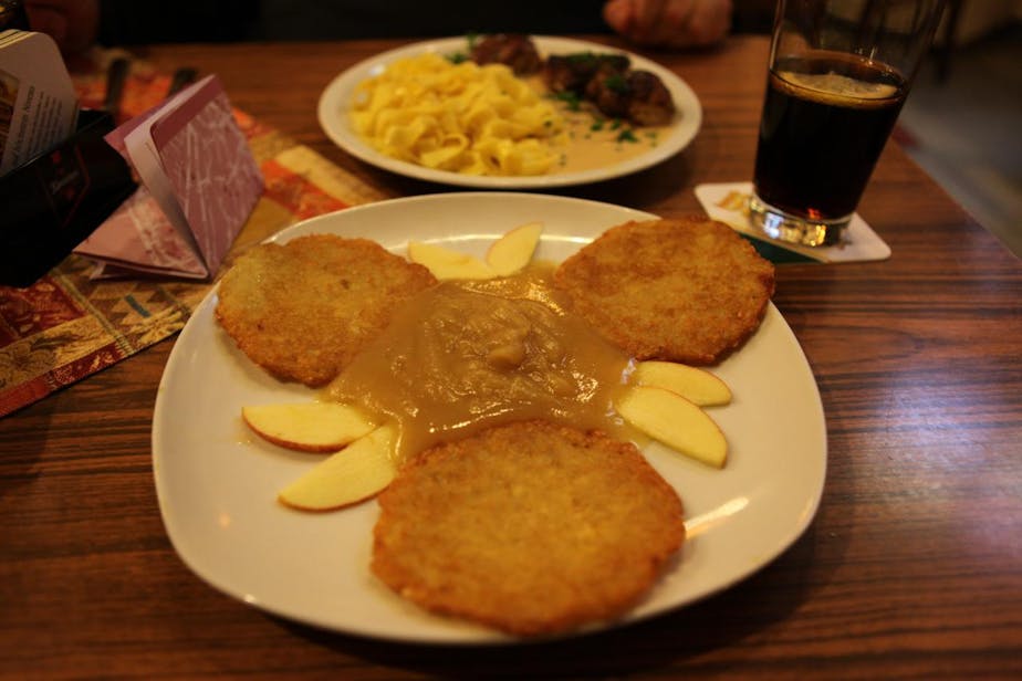 While David was on his long errand at the Hertz office, I went out in the rain to explore the city some more, and stopped for a light lunch of potato pancakes at one of the many German restaurants on the main street. I ended up sharing a table yet again, with two ladies around 60 who laughed and chatted with each other the whole time. They didn't try to talk to me after noticing the waitress speaking to me in English, but they were very nice and friendly. They wished me a warm Wilkommen when I joined them at the table and thanked me happily when I said Guten appetit when their food arrived - that's another fun German custom between strangers that I like very much.
