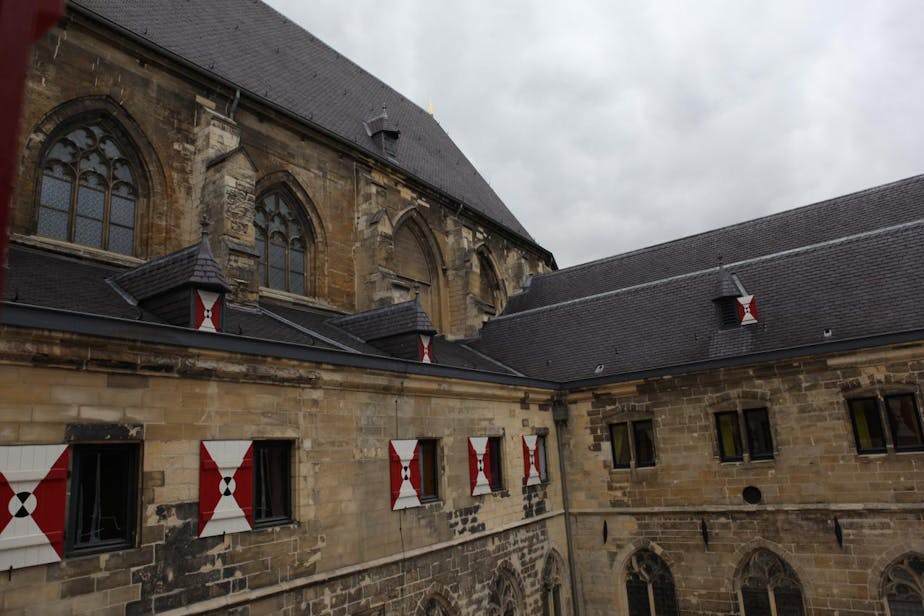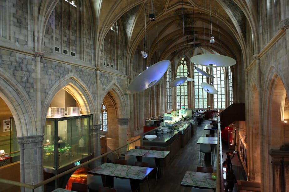 Friday afternoon we drove from Cologne to Maastricht, in the far southwest corner of the Netherlands. It is a historic city and seemed to make a good stop on the way to France. Best yet, we got to sleep in a Gothic monastery! We stayed in the Kruisherenhotel, an ultra-modern hotel built inside a 15th-century church and monastery. Our small, pretty hotel room is in the monastery and overlooks the cloister. The reception, restaurant, and lounge are in the church, which is amazing! You can read a book on a plush modern sofa in a former side chapel, right across from a medieval altar. Magnificent! I wonder if I can find a medieval stone altar for our house...