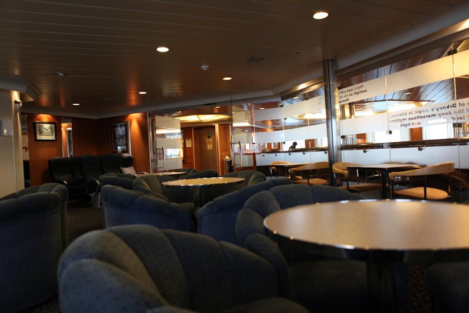 But the ferry was larger and nicer than we expected and the crossing was remarkably smooth given the conditions; just a lot of gentle rocking that almost put us to sleep. Going out on the deck was an adventure, though - I could barely pry the door open in the wind!