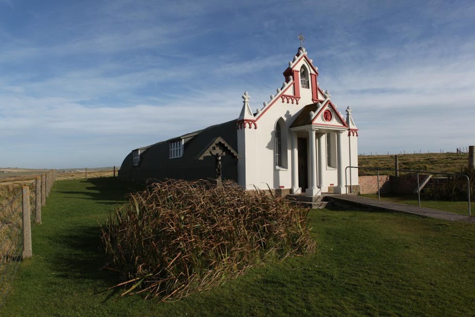 The barriers were built by prisoners of war, including Italians who managed to build quite a nice chapel for themselves in their prison camp, using two huts put together and decorated by an especially artistic prisoner. It's the only building that survives from their camp today.