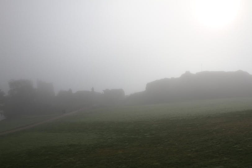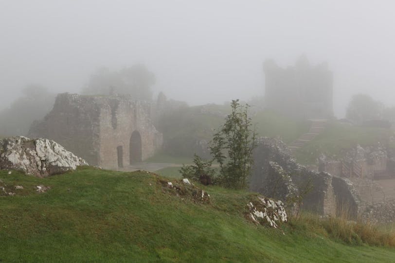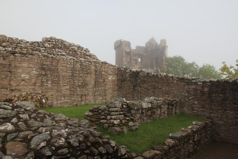 Foggy views of the ruins of Urquhart Castle on Loch Ness: