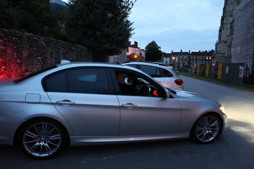 In the terminal building we met up with Brian, a very nice New Zealander who delivered our rental car from London. We have really been looking forward to having this car! In light of the ambitious itinerary I planned for us all over the UK, which David accepted good-naturedly as always, I thought we should splurge on something a little more fun for him to drive than usual. We decided on a BMW M3 diesel, and she's lovely in person. After inspections with Brian and a few signatures, David was behind the wheel on the wrong side of the car and we were on our way.